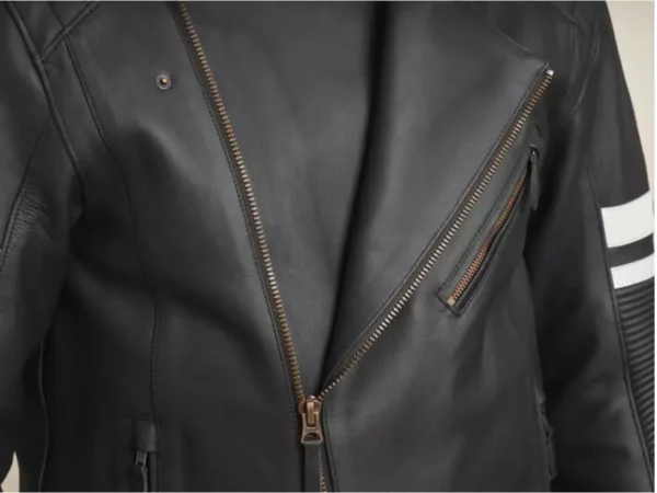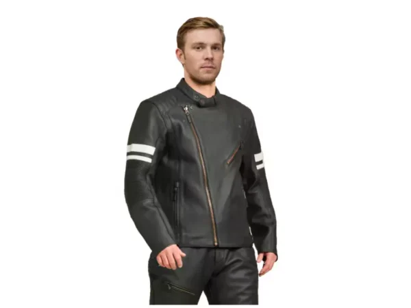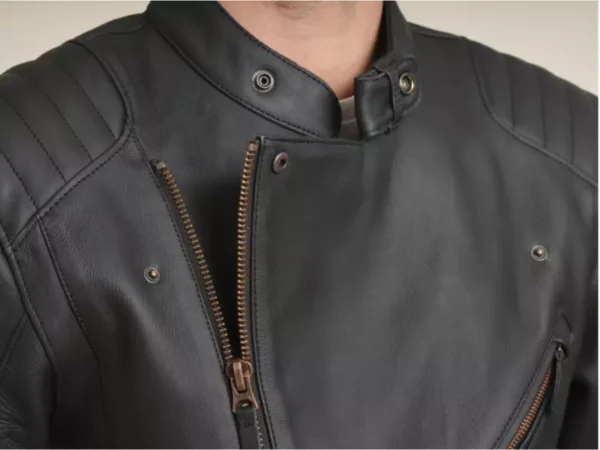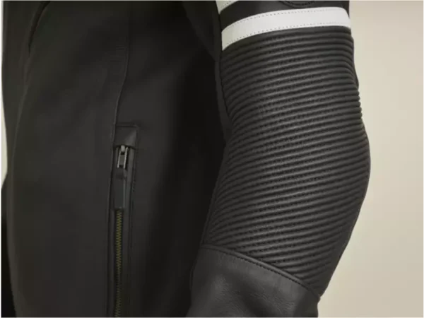 La chaqueta tiene un exterior de piel de vacuno 100% resistente, siendo flexible en sus movimientos, en particular gracias a inserciones elásticas en las mangas.
