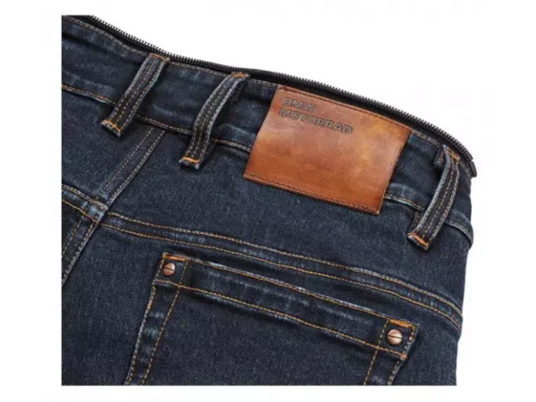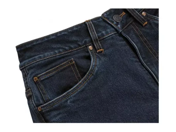 Los Jeans RoadCrafted de BMW están confeccionados con un abundante denim elástico. Debajo del material resistente se encuentran los protectores de rodilla y cadera NP-Flex de BMW, que disipan el impacto y mantienen un perfil bajo. El diseño de cinco bolsillos utiliza un denim con resistencia a la abrasión diseñado en la propia tela.