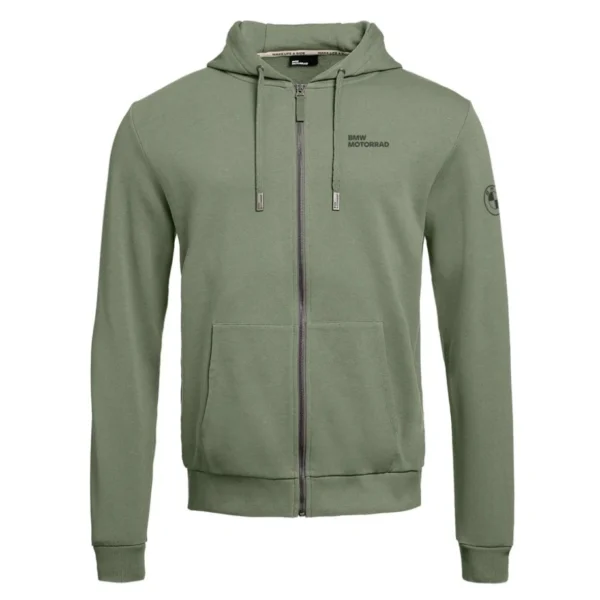 Hoodie de cremallera cómodo con logo de BMW en el pecho e inscripción de BMW Motorrad en la parte trasera.